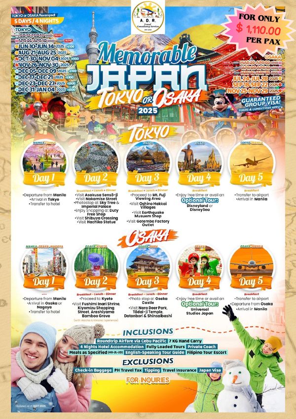 Experience the wonders of Japan in this 5 Days / 4 Nights Tokyo or Osaka getaway for only $1,110.00 per person! Fly roundtrip via Cebu Pacific. Explore iconic destinations like Sky Tree & Imperial Palace, Mt. Fuji Viewing Area, Shibuya Crossing, Hachiko Statue, Disney Land, Arashiyama Bamboo Grove, Nara Deer Park, Fushimi Inari Shrine, Universal Studios Japan and more — with all meals, private coach, full tours, and local guides included.